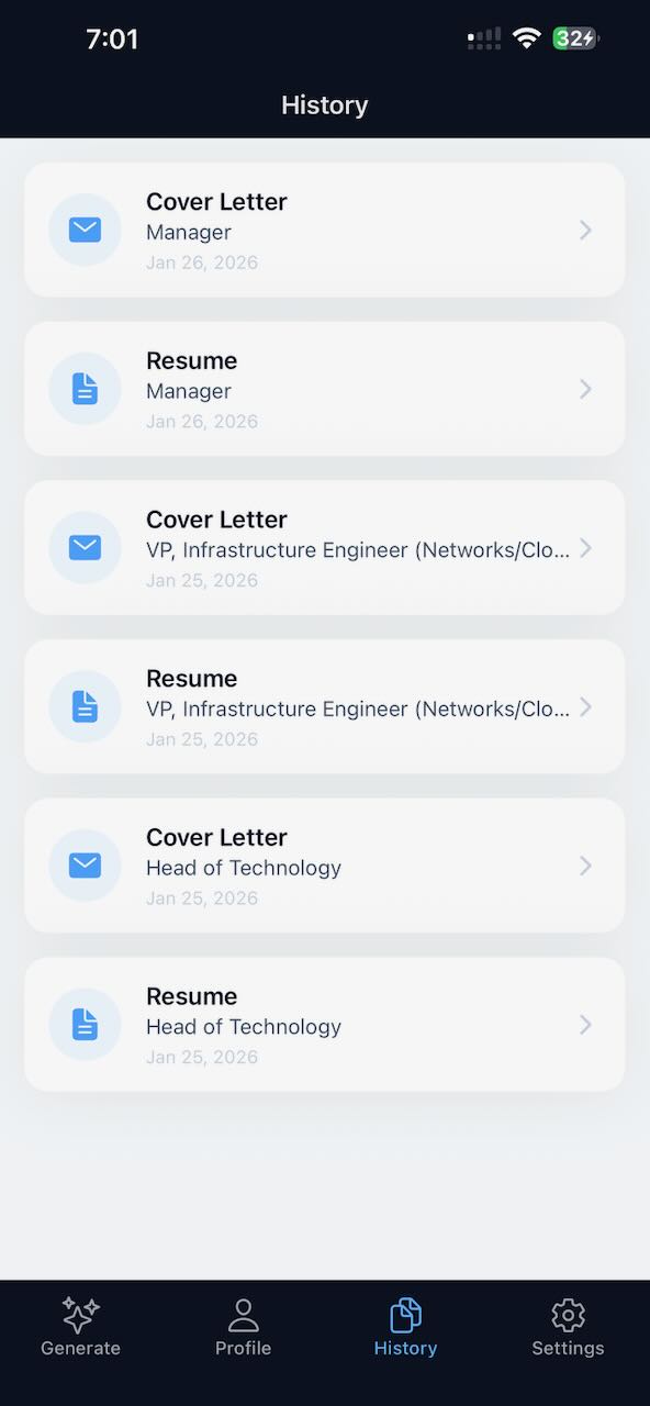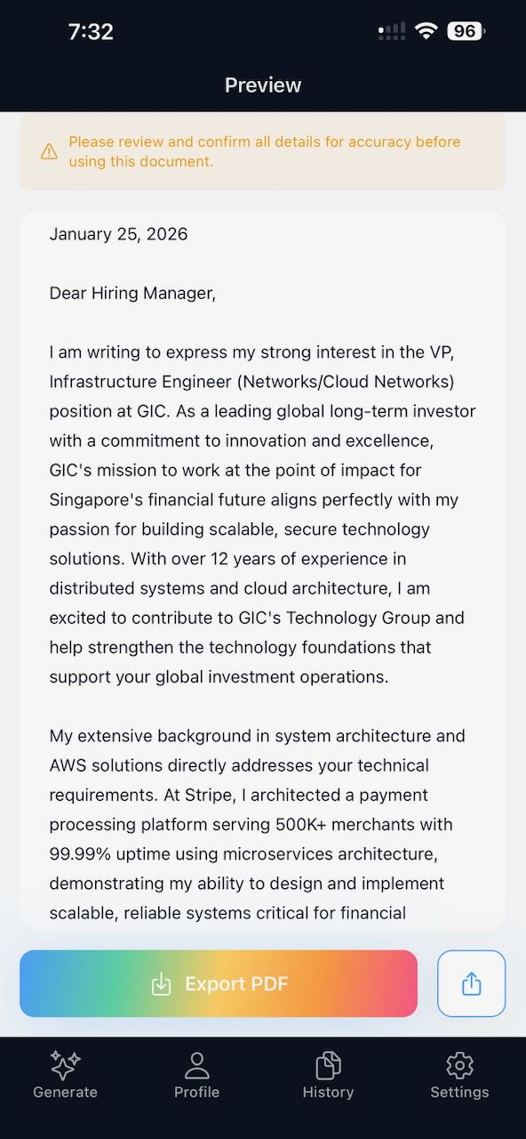 Create personalised, professional cover letters instantly — no generic templates or manual writing.