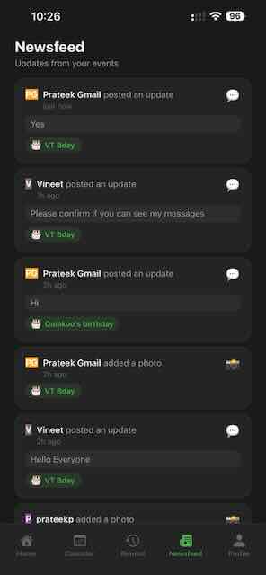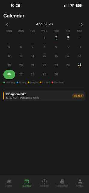 An Activity Feed groups all updates by event, a built-in Calendar view gives you a month-at-a-glance, and the Explore tab surfaces public events nearby.